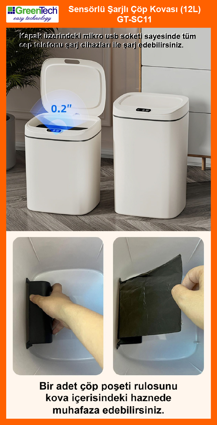 Greentech Sensörlü Şarjlı 12 Litre Çöp Kovası / GT-SC11